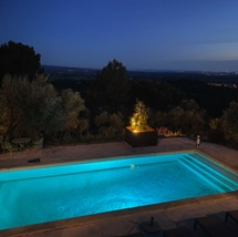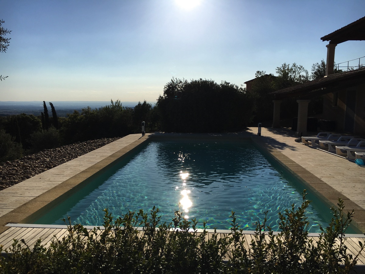 Er is een mooi zwembad (10 x 4,5 m) met instaptredes binnenin over de volledige breedte, dat ’s avonds kan worden verlicht. Er is een zwembad-alarm met laser. Er is tuingerief voor 10 personen (deels teak, deels 'fer forgé') om buiten te kunnen eten en te kunnen zonnen aan het zwembad, en daar weg te dromen bij het mooie uitzicht. Het terras op niveau zwembad staat in verbinding met een grote berging waar al het zwembadgerief en tuinmeubilair zijn opgeslagen. Fietsen kunnen veilig worden gestald in de berging.